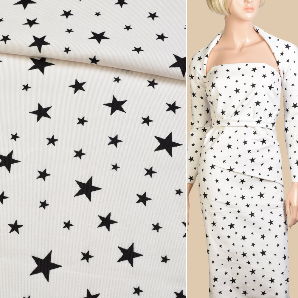 Микровельвет стрейч белый в черные звезды ш.140. Состав ткани: Хлопок-94, Эластан-6. Плотность ткани: 298 г/м.кв. Страна производитель: Германия. Вельвет имеет множество свойств: он очень прочный и эластичный,