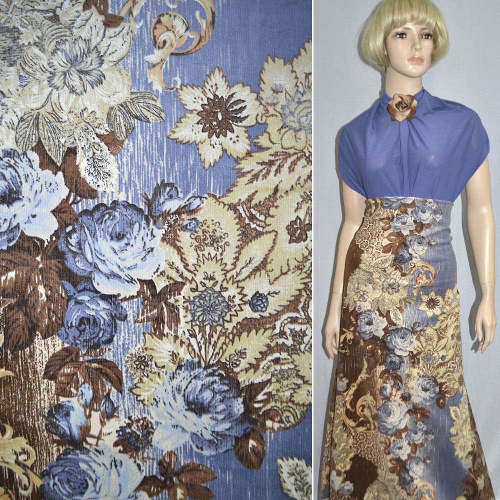 Вельвет стрейч коричнево-голубой с цветами, ш.140 купить в розницу и оптом