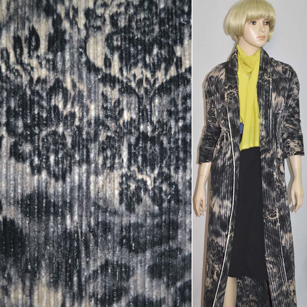 Вельвет стрейч крупный бежевый с черными цветами, ш.150. Состав ткани: Хлопок-97, Эластан-3. Плотность ткани: 370 г/м.кв. Страна производитель: Германия. Вельвет отличается от других материалов характерными продольными полосами-рубчиками из ворса на лицевой стороне. Изнанка у материала ровная и похожая на холст. Он бархатистый, с мягкой фактурой и приятный на ощупь. Игра света, отражаясь между рядами, придает полотну легкий блеск и благородный вид.