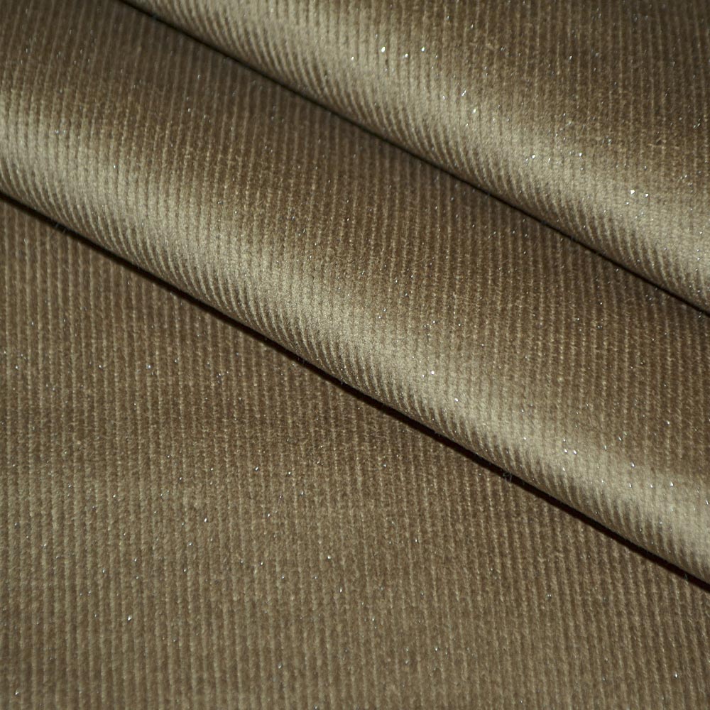 Микровельвет стрейч коричневый светлый с серебряными блестками ш.140. Состав ткани: Хлопок-97, Эластан-3. Плотность ткани: 288 г/м.кв. Страна производитель: Южная Корея. Вельвет — это плотная ткань с бархатистой текстурой, обычно хлопчатобумажная. От бархата ее отличает наличие рубчиков на ворсистом покрытии. Они придают дополнительную устойчивость к истиранию и привлекательный вид. Обладает теплосберегающими свойствами, гигроскопичностью, драпируется мягко в струящиеся, обтекаемые складки. Ткань практичная, легко восстанавливается после смятия и не капризная в уходе. Подходит для пошива изделий с мягкой формой, костюмов, юбок, платьев, рубашек, комбинезонов и аксессуаров.