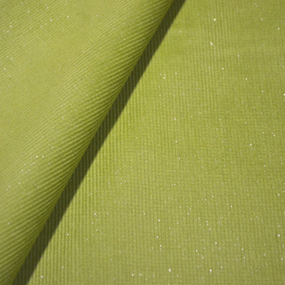 Микровельвет стрейч салатовый с серебряными блестками ш.140. Состав ткани: Хлопок-97, Эластан-3. Плотность ткани: 300 г/м.кв. Страна производитель: Южная Корея. Вельвет — ворсистая ткань, которую трудно не узнать: отличается наличием на лицевой стороне рубчика различной ширины. Изделия, выполненные из этого материала, сохранят безупречную форму, вид и цвет в течение всего срока эксплуатации, при условии, что вы обеспечите им должный уход – своевременную стирку, глажку и сушку при соответствующем режиме. Ткань обладает целым рядом достоинств: эстетична и долговечна, хорошо держит тепло, сохраняет форму, практична в уходе.