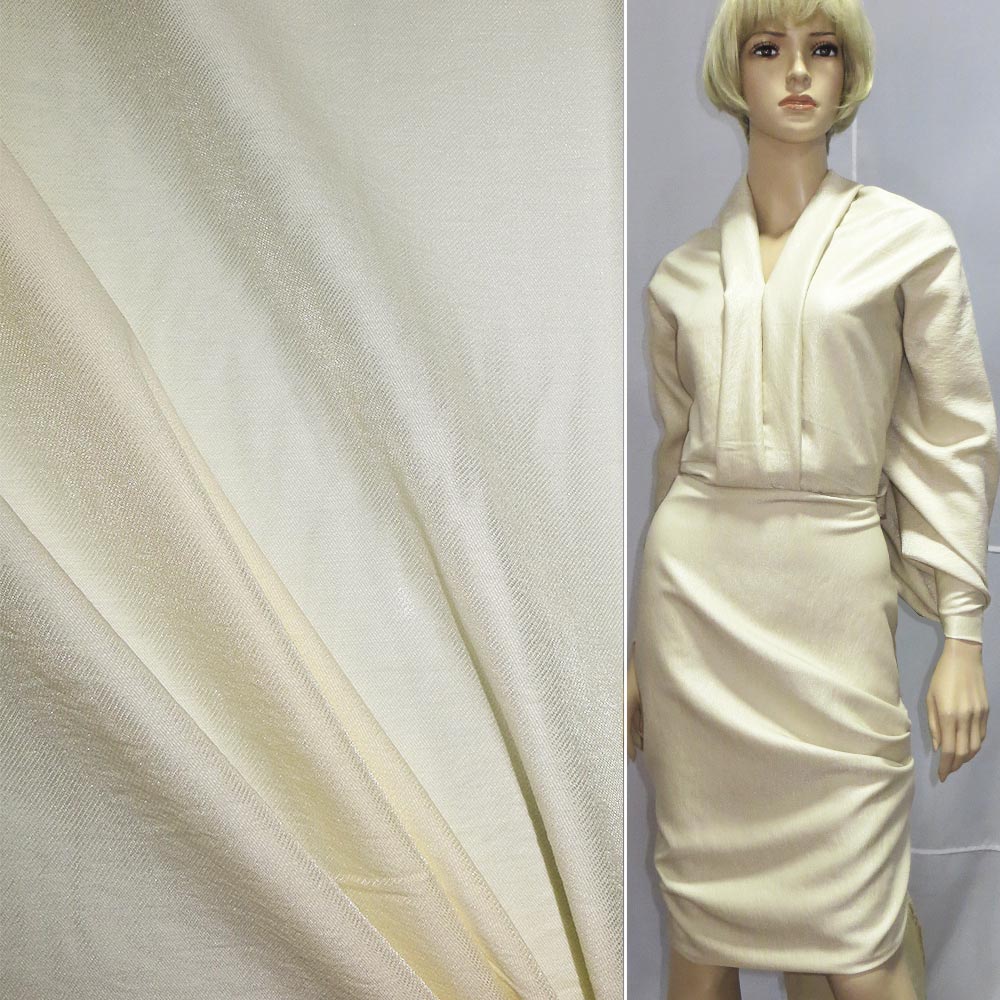 Вискоза с органзой диагональ молочная, ш.150. Состав ткани: Вискоза-80, Капрон-20. Плотность ткани: 93 г/м.кв. Страна производитель: Южная Корея. Вискоза – это достаточно интересный материал, тем, что он может быть похож на шелк, шерсть или лен. Ткань, которая получается из вискозы очень приятная и мягкая на ощупь, образовывает на изделиях красивые складки. Из-за своей достаточно высокой гигроскопичности, вискоза способна впитать много влаги, так, например, по сравнению с хлопком, она впитывает ее в два раза больше. Из вискозного полотна шьют одежду, так как «нетканка» впитывает влагу и «дышит», при этом никогда не вызывает аллергию. Чаще всего из вискозы шьют подкладки для одежды. В домашнем хозяйстве можно часто встретить вискозное постельное белье, скатерти, шторы.