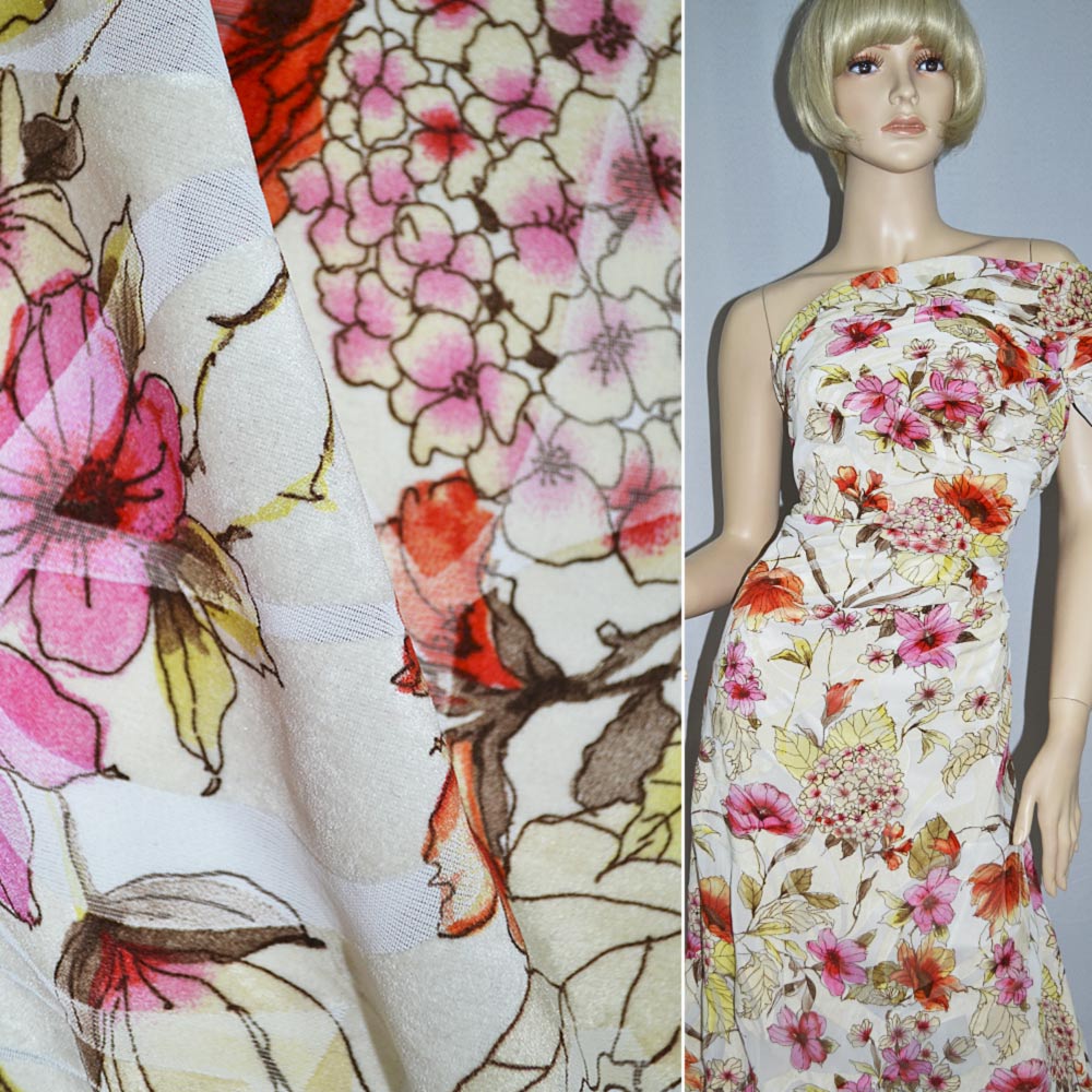 Вискоза блузочная молочная с розово-красными цветами и флоком ш.140. Состав ткани: Вискоза-100. Плотность ткани: 143 г/м.кв. Страна производитель: Германия. Полотно из вискозы отличается мягкостью и легкостью, оно нежное на ощупь и привлекательное на вид. Вискозная ткань в зависимости от состава приобретает схожесть с шелком, шерстью, трикотажем, льном. С помощью скрученных вискозных нитей ткут прочный шероховатый креп, вещи из него получаются красивыми и «богатыми» на вид. Такая ткань обладает повышенной износостойкостью. Вискозное полотно используется для пошива женской одежды. Из нее получаются легкие, почти невесомые блузки, платья и юбки для лета. Вещи красиво облегают фигуру, не выходят из моды много лет. Интересные модели выставляются на модных показах. Популярность и востребованность вискозы трудно переоценить. Она применяется в массовом производстве детской и домашней одежды – халатов, пижам.