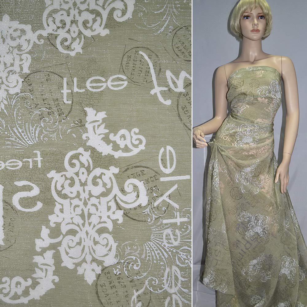 Вискоза оливковая с белым абстрактным рисунком деворе и органзой ш.140 купить в розницу и оптом