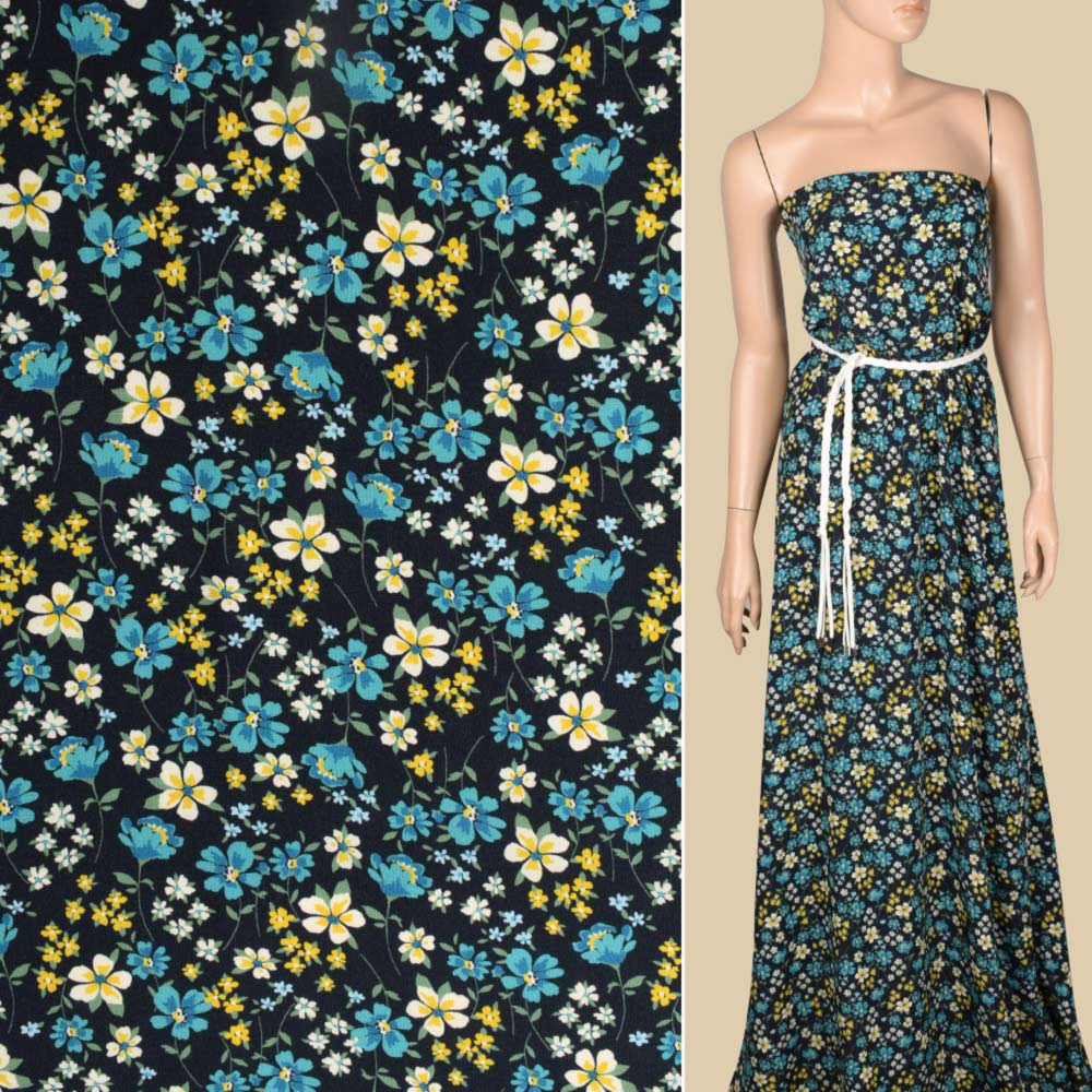 Креп вискозный синий темный, бело-желтые, бирюзовые цветы, ш.140 купить в розницу и оптом