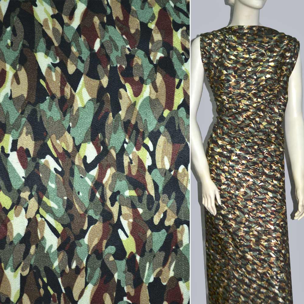 Вискоза камуфляжная ш.147. Состав ткани: Вискоза-100. Плотность ткани: 140 г/м.кв. Страна производитель: Германия. По своей структуре вискоза, очень напоминает шелк, легче чем хлопок, а значит, что ее более целесообразно использовать при пошиве летней одежды. Ей не свойственно накопление статического электричества, то есть при взаимодействии с другими тканями или поверхностями она не электризуется. Данное сукно является очень приятным на ощупь, мягким и хорошо тянется, что позволяет использовать его в производстве детской одежды и домашнего текстиля. Материал не склонен вызывать аллергические реакции и дерматиты. Можно применять для пошива детской одежды. Вискоза приятна для тела, способствует согреву зимой и создает комфортную температуру в жару. Материал способствует впитыванию влаги и пропускает воздух. Вискоза может быть совершенно любого цвета, после стирок надолго сохраняет привлекательный и яркий цвет.