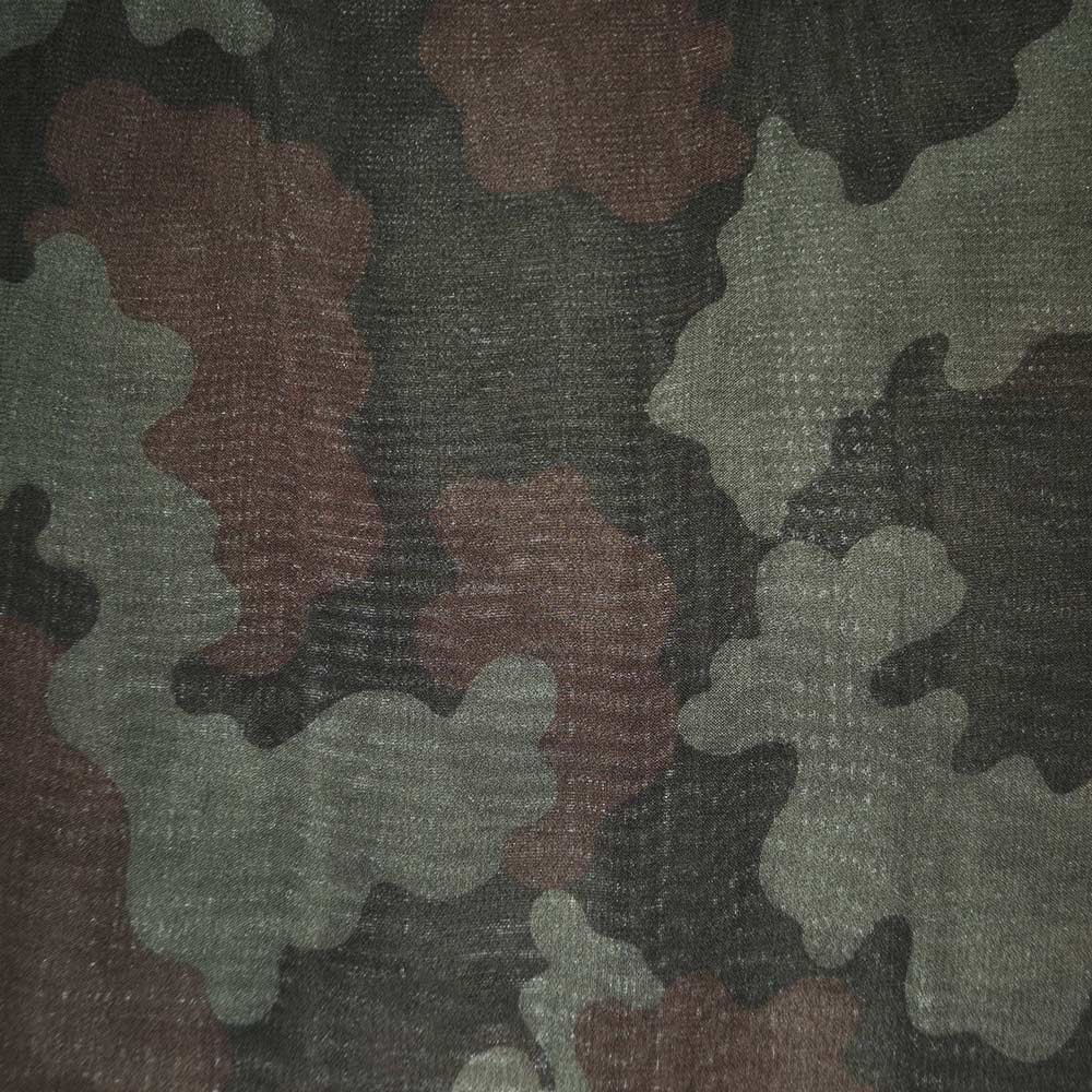 Вискоза коричневая в оливковые, зеленые пятна (камуфляж), ш.145. Состав ткани: Вискоза-100. Плотность ткани: 92 г/м.кв. Страна производитель: Южная Корея. По своей структуре вискоза, очень напоминает шелк, легче чем хлопок, а значит, что ее более целесообразно использовать при пошиве летней одежды. Ей не свойственно накопление статического электричества, то есть при взаимодействии с другими тканями или поверхностями она не электризуется. Данное сукно является очень приятным на ощупь, мягким и хорошо тянется, что позволяет использовать его в производстве детской одежды и домашнего текстиля. Материал не склонен вызывать аллергические реакции и дерматиты. Можно применять для пошива детской одежды. Вискоза приятна для тела, способствует согреву зимой и создает комфортную температуру в жару. Материал способствует впитыванию влаги и пропускает воздух. Вискоза может быть совершенно любого цвета, после стирок надолго сохраняет привлекательный и яркий цвет.