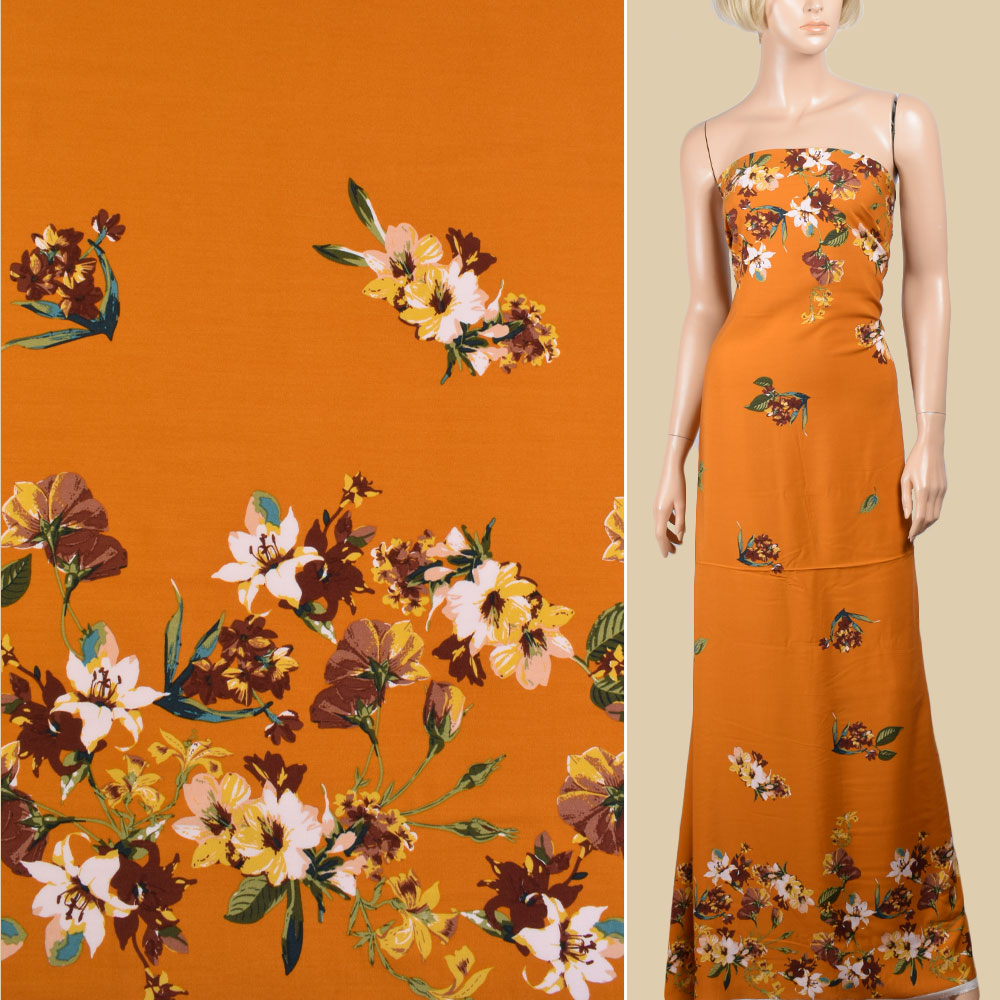 Вискоза коричневая, желтые цветы (купон), ш.140. Состав ткани: Вискоза-100. Плотность ткани: 108 г/м.кв. Страна производитель: Германия. Вискоза – это достаточно интересный материал, тем, что он может быть похож на шелк, шерсть или лен. Ткань, которая получается из вискозы очень приятная и мягкая на ощупь, образовывает на изделиях красивые складки. Из-за своей достаточно высокой гигроскопичности, вискоза способна впитать много влаги, так, например, по сравнению с хлопком, она впитывает ее в два раза больше. Из вискозного полотна шьют одежду, так как «нетканка» впитывает влагу и «дышит», при этом никогда не вызывает аллергию. Чаще всего из вискозы шьют подкладки для одежды. В домашнем хозяйстве можно часто встретить вискозное постельное белье, скатерти, шторы.