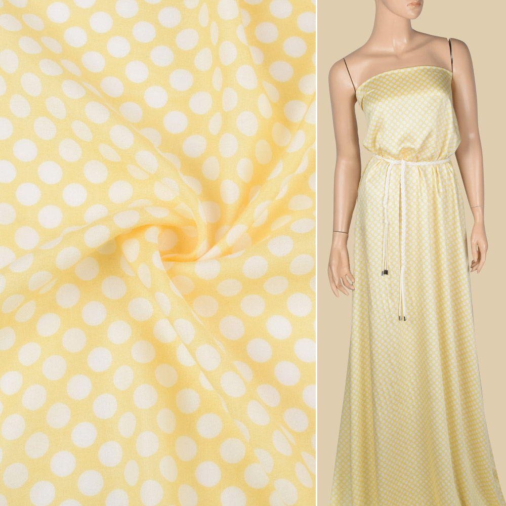 Вискоза молочно-желтая в белый горох, ш.140 купить в розницу и оптом