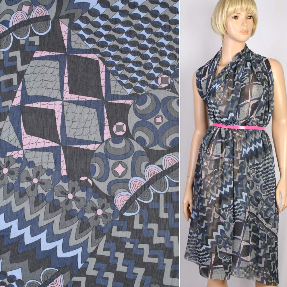 Вискоза жатая серая в сине-серый абстрактный рисунок, ш.145 купить в розницу и оптом