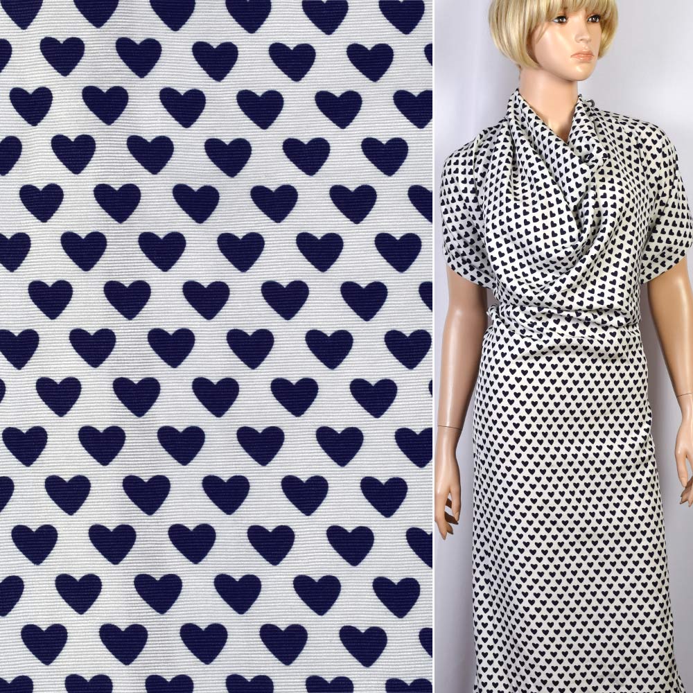 Репс вискозный белый в синие сердечки ш.155. Состав ткани: Вискоза-100. Плотность ткани: 168 г/м.кв. Страна производитель: Южная Корея. Репсовая ткань очень практична и при этом удобна в носке. Она почти не растягивается и отлично подходит для создания облегающей одежды. Вместе с тем плотность материи позволяет изготавливать устойчивые складки и драпировки.Материал способствует впитыванию влаги и пропускает воздух. Может быть совершенно любого цвета, после стирок надолго сохраняет привлекательный и яркий цвет. Из них изготавливают женскую и мужскую одежду: брюки, летние костюмы, платья, блузки и юбки. Лентами из репса украшают шляпки и различные аксессуары. В производстве обуви также не обойтись без репса, из которого изготавливают модные отделочные элементы для ботинок и сапог.