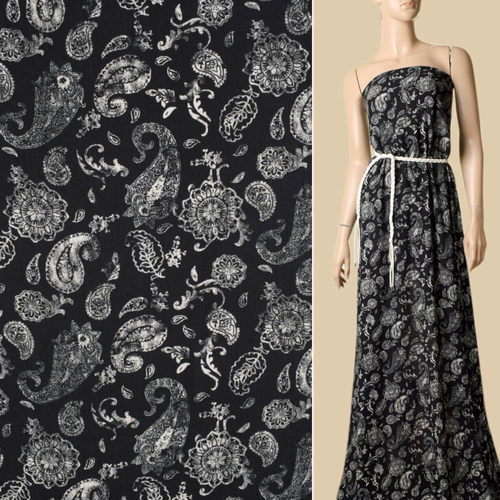 Вискоза жатая черная, белые огурцы, цветы, ш.135 купить в розницу и оптом