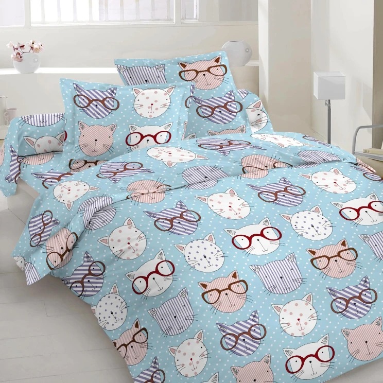 Бязь набивная голубая, коты в очках, ш.220 купить в розницу и оптом