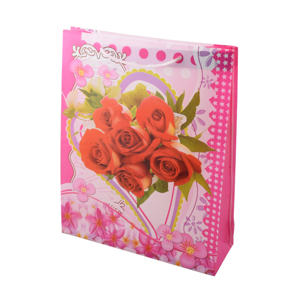Пакет подарочный 38х30 см с розами в сердце розово-красный купить в розницу и оптом