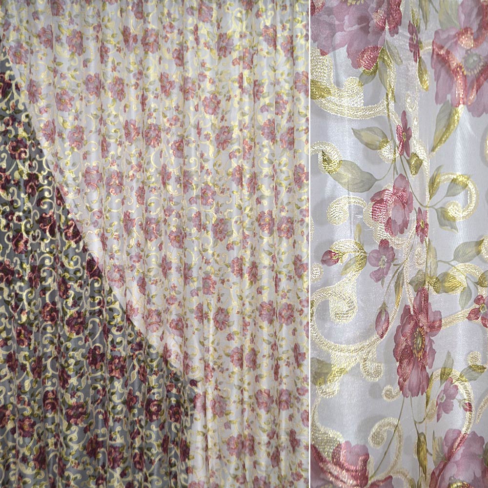 Органза жакардова тюль вензель з метанітью золотистої, принт півонії бордові, молочна, ш.275 купить в розницу и оптом