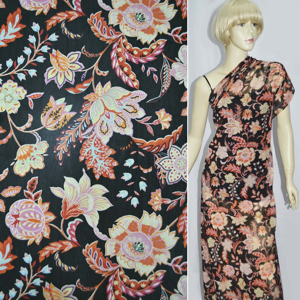 Сітка стрейч чорна з принтом ш.140. Склад тканини: Поліамід-90, Еластан-10. Щільність тканини 60 г/м.кв. Країна виробник: Німеччина. Тонкий, м'який, еластичний матеріал у дрібну сітку. З нанесеним на неї кольоровим малюнком. Сітка практична, легка, добре пропускає повітря, легка в обробці. Використовується для пошиття легких літніх суконь, вечірнього вбрання, аксесуарів, хусток.Дякуємо за ваш вибір.