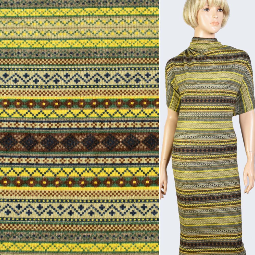 Трикотаж бежевий в жовті, зелені смужки з орнаментом, ш.165 купить в розницу и оптом