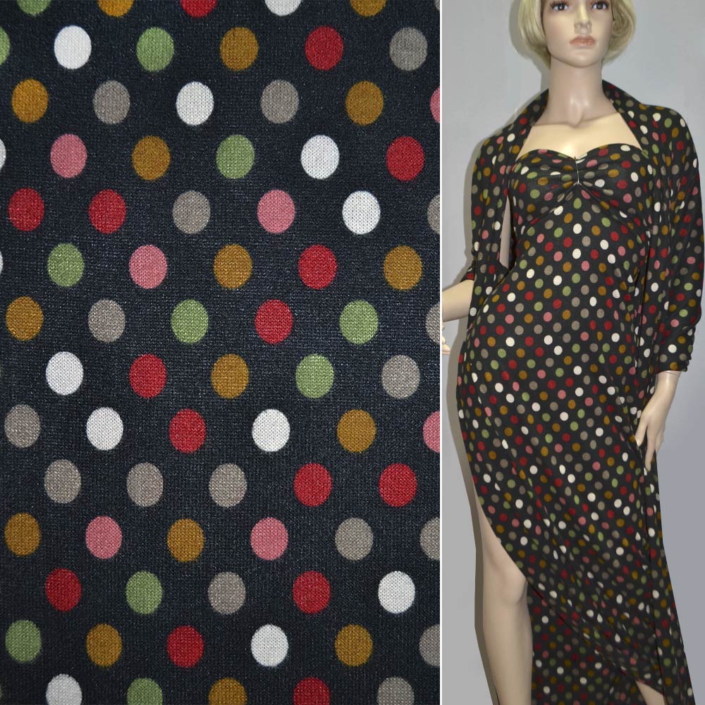 Трикотаж чорний з різнокольоровими колами ш.170. Склад тканини: Поліакріл-85, Вовна-10, Еластан-5. Щільність тканини 166 г/м.кв. Країна виробник: Південна Корея. Трикотаж – це м'яка щільна матерія, не прозора. Приємна на дотик, комфортна в носінні. Завдяки вмісту синтетичних матерій, матеріал більш зносостійкий та надовго зберігає свій первісний вигляд. Тканина відрізняється своєю приємною текстурою, гарною розтяжністю, практично не помається, добре драпірується. Трикотаж досить простий у догляді. Використовується для пошиття суконь, спортивних костюмів, легких жакетів, поло, футболок та багато іншого.Дякуємо за ваш вибір.