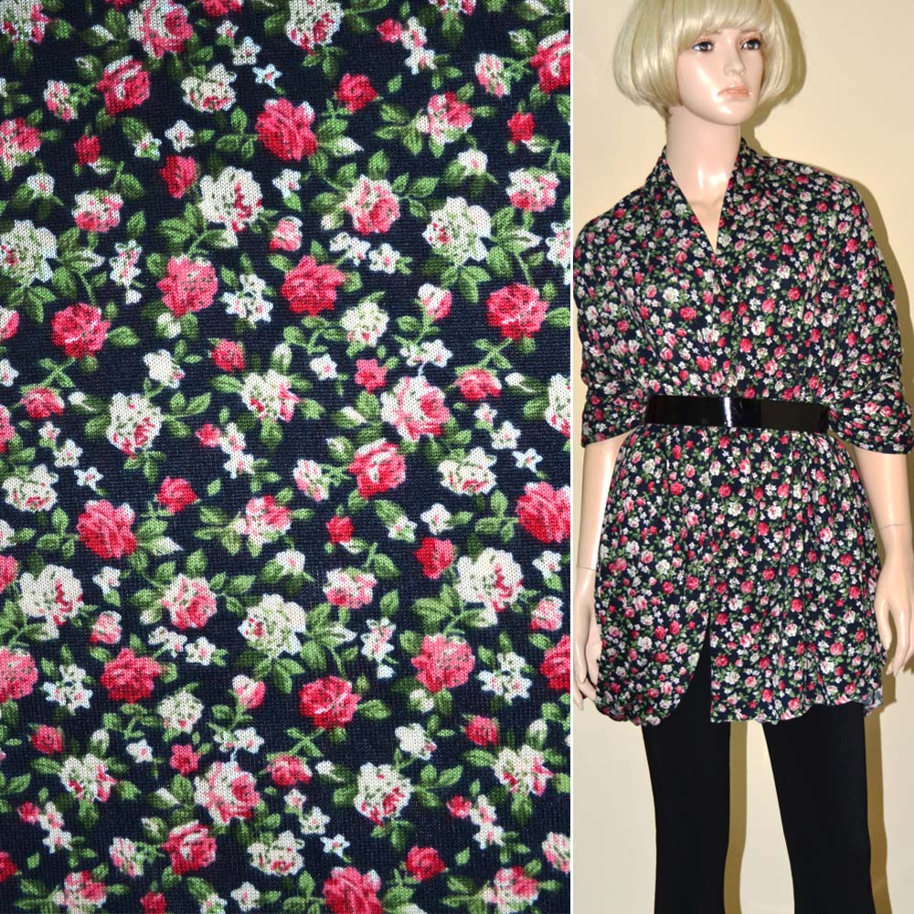 Трикотаж синій темний з біло-рожевими квітами ш.160. Склад тканини: Поліакріл-85, Вовна-10, Еластан-5. Щільність тканини 177 г/м.кв. Країна виробник: Південна Корея. Трикотаж – це м'яка щільна матерія, не прозора. Приємна на дотик, комфортна в носінні. Завдяки вмісту синтетичних матерій, матеріал більш зносостійкий та надовго зберігає свій первісний вигляд. Тканина відрізняється своєю приємною текстурою, гарною розтяжністю, практично не здається. Трикотаж досить простий у догляді. Використовується для пошиття суконь, спортивних костюмів, легких жакетів, поло, футболок та багато іншого.Дякуємо за ваш вибір.