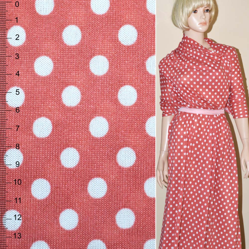 Трикотаж теракотовий світлий в білий горох ш.170. Склад тканини: Поліакріл-85, Вовна-10, Еластан-5. Щільність тканини 170 г/м.кв. Країна виробник: Південна Корея. Трикотаж – це м'яка щільна матерія, не прозора. Приємна на дотик, комфортна в носінні. Завдяки вмісту синтетичних матерій, матеріал більш зносостійкий та надовго зберігає свій первісний вигляд. Тканина відрізняється своєю приємною текстурою, гарною розтяжністю, практично не помається, добре драпірується. Трикотаж досить простий у догляді. Використовується для пошиття суконь, спортивних костюмів, легких жакетів, поло, футболок та багато іншого.Дякуємо за ваш вибір.