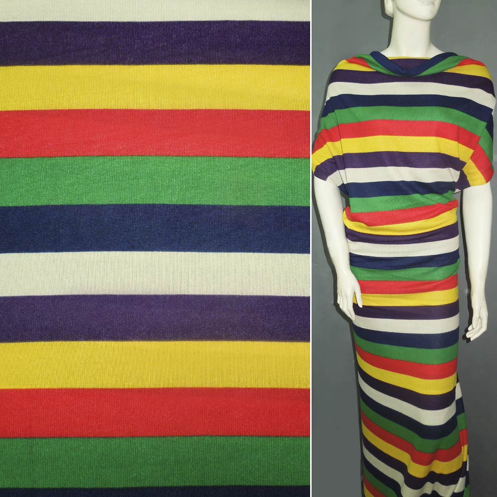 Трикотаж в смужку жовто-фіолетово-зелено-червону ш.160. Склад тканини: Поліакріл-85, Вовна-10, Еластан-5. Щільність тканини 186 г/м.кв. Країна виробник: Південна Корея. Трикотаж – це м'яка щільна матерія, не прозора. Приємна на дотик, комфортна в носінні. Завдяки вмісту синтетичних матерій, матеріал більш зносостійкий та надовго зберігає свій первісний вигляд. Тканина відрізняється своєю приємною текстурою, гарною розтяжністю, практично не здається. Трикотаж досить простий у догляді. Використовується для пошиття суконь, спортивних костюмів, легких жакетів, поло, футболок та багато іншого.Дякуємо за ваш вибір.
