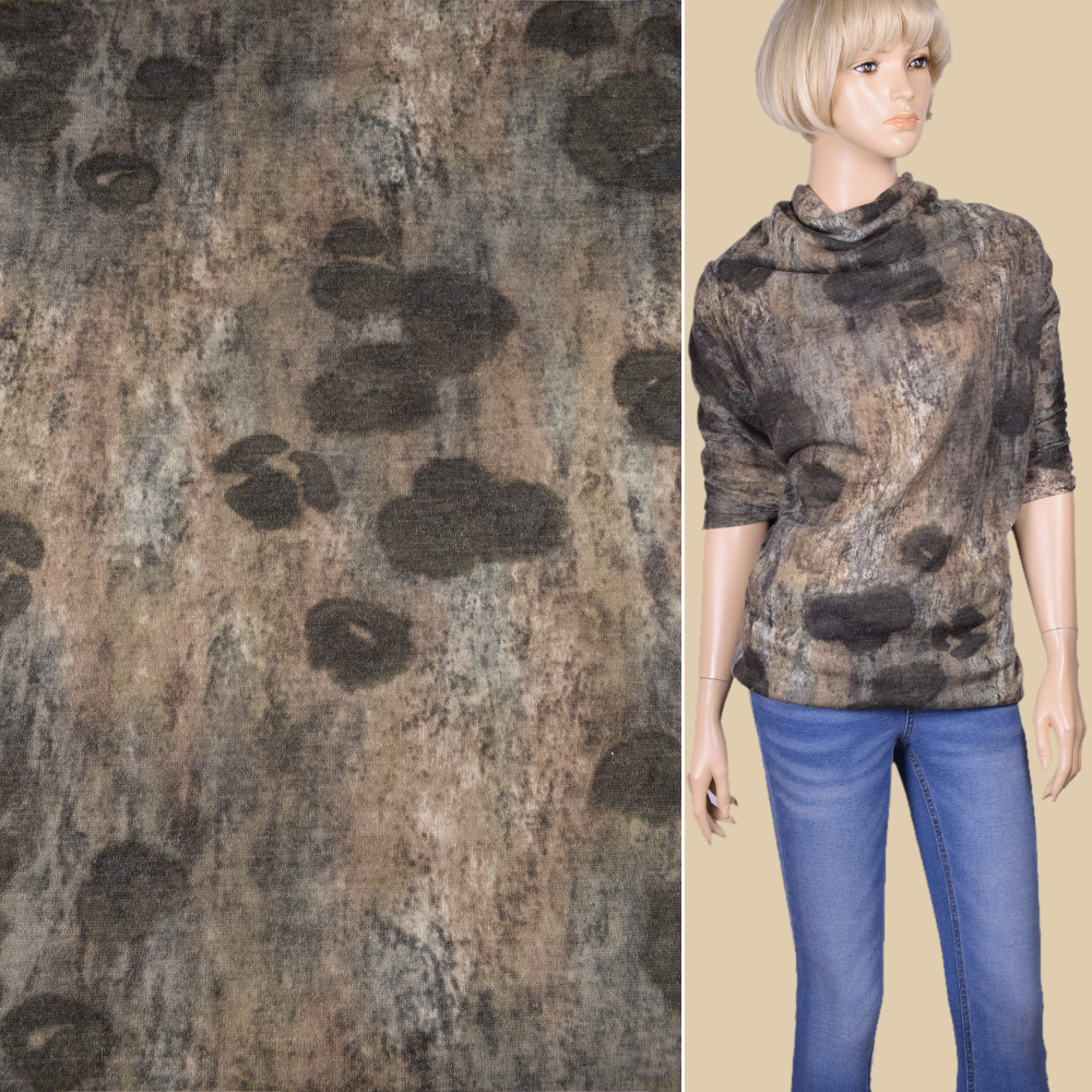 Трикотаж з мохером болотно-сірий з коричневими плямами ш.143. Склад тканини: Мохер-8, Поліакріл-77, Поліамід-15. Щільність тканини 165 г/м.кв. Країна виробник: Німеччина. Трикотаж – це м'яка щільна матерія, не прозора. Приємна на дотик, комфортна в носінні. Завдяки вмісту синтетичних матерій, матеріал більш зносостійкий та надовго зберігає свій первісний вигляд. Тканина відрізняється своєю приємною текстурою, гарною розтяжністю, практично не здається. Трикотаж досить простий у догляді. Використовується для пошиття суконь, спортивних костюмів, легких жакетів, поло, футболок та багато іншого.Дякуємо за ваш вибір.