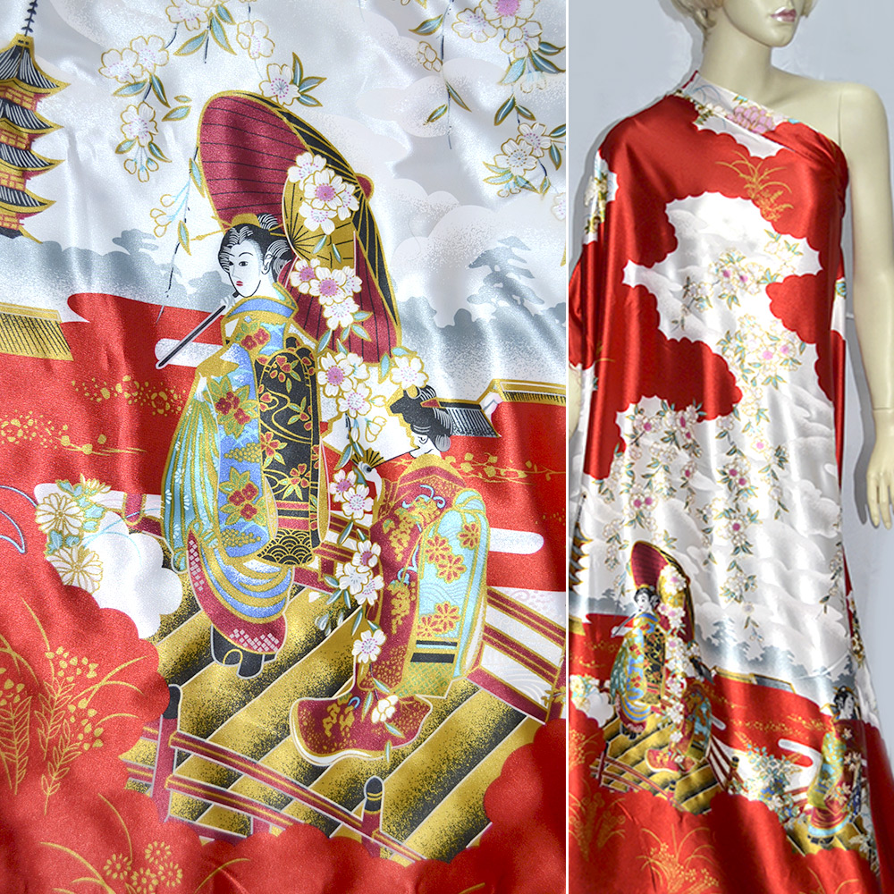 Атлас стрейч білий зі східними дівчатами ш.150. Склад тканини: Поліестер-97, Еластан-3. Щільність тканини 73 г/м.кв. Країна виробник: Південна Корея. Тканина атлас за описом відноситься до різновидів шовку (напівшовку). Відмінною особливістю полотна є спеціальне плетіння, яке називається атласним. Гладкість лицьової сторони забезпечує те, що поздовжні нитки чергуються з основою певної послідовності. Качок виходить на обличчя тканини через 5-6 ниток основи.