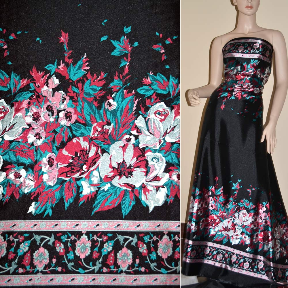 Атлас стрейч чорний, двосторонній купон в сіро-зелені маки ш.150 купить в розницу и оптом