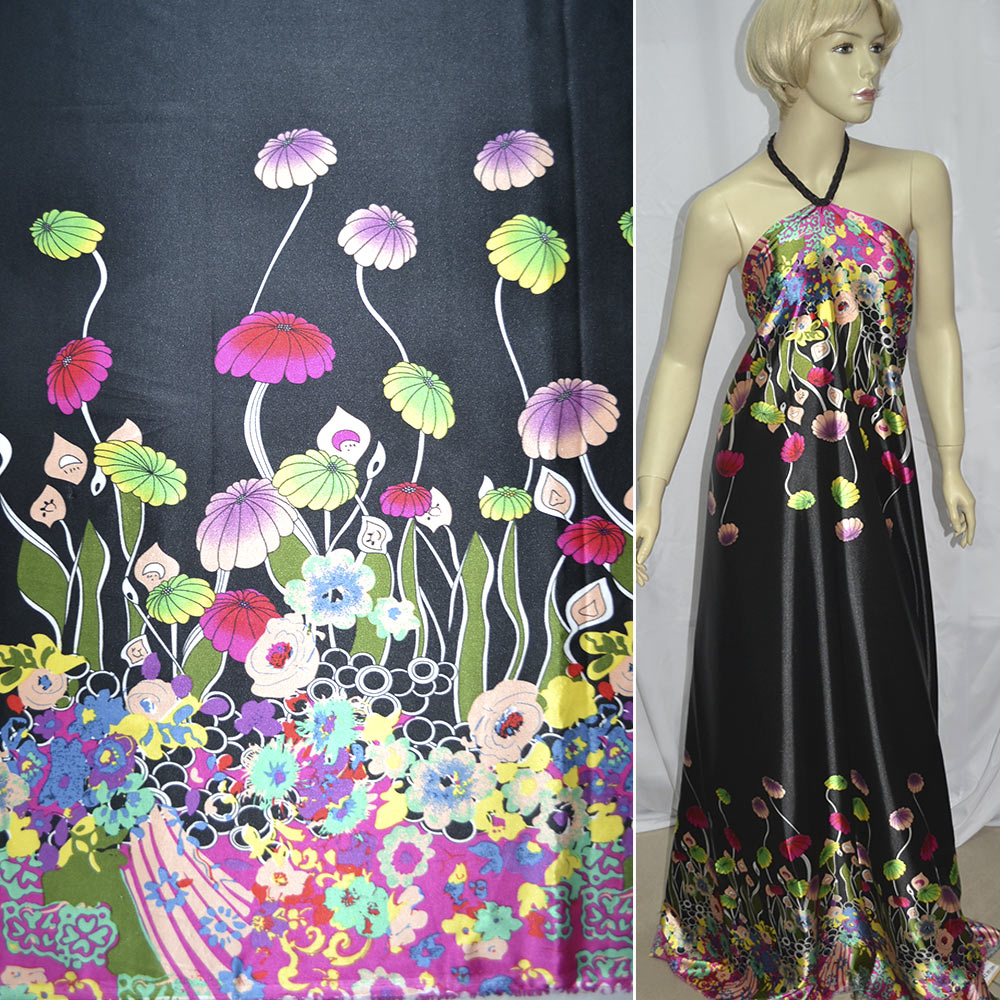 Атлас стрейч чорний, двосторонній купон в яскраві квіти ш.150 купить в розницу и оптом