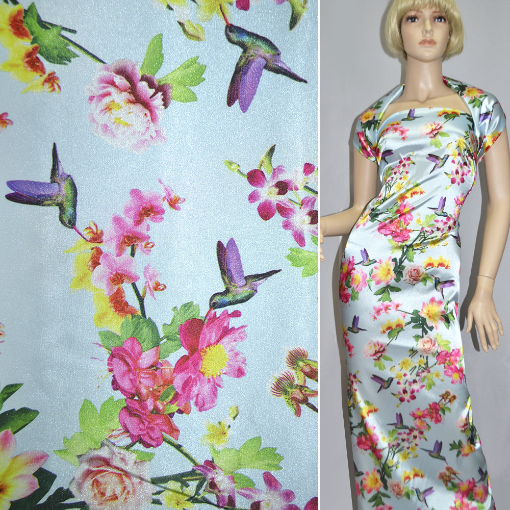Атлас стрейч блідо-блакитний з різнокольоровими квітами та птахами ш.150 купить в розницу и оптом