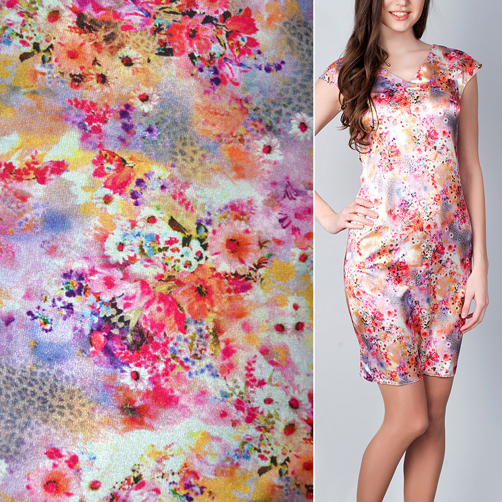 Атлас стрейч рожево-жовтий з дрібними букетами квітів (принт) ш.154. Склад тканини: Поліестер-97, Еластан-3. Щільність тканини 76 г/м.кв. Країна виробник: Південна Корея. Вироби, виконані з атласу - будь то одяг або предмети інтер'єру - завжди виглядають гідно і радують око. Це щільна міцна тканина з шовковим благородним блиском. Має дві сторони – гладку лицьову та матову виворітну. Атлас має безліч переваг, такі як гігроскопічність, міцність, хороше драпірування, повітропроникність. Відмінно поєднується з органзою, оксамитом, шифоном, мереживом.Дякуємо за ваш вибір.