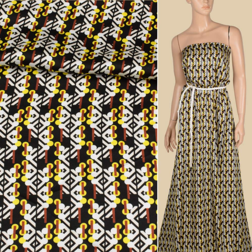 Віскоза атласна чорна в чорно-білий візерунок, жовтий горох, ш.146 купить в розницу и оптом
