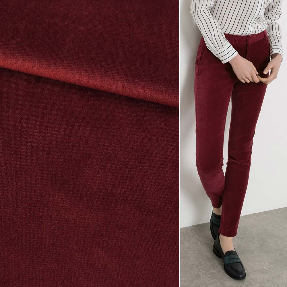 Велюр костюмний бордовий (стигла вишня) ш.155. Склад тканини: Поліестер-97, Еластан-3. Щільність тканини 236 г/м.кв. Країна виробник: Південна Корея. Даний велюр - тканина високої якості, він має гладке виворот і фактурне оксамитове лицьове покриття. Вміст поліестеру робить його ідеальним для прання, хоча ми радимо дотримуватися додаткового догляду, наприклад, ручного прання цієї тканини, щоб зберегти високу якість виробу. Цей розкішний м'який оксамит, який не залишить Вас байдужим. Тканина чудово підходить для такого одягу, як сукні, жакети та штани, а також костюми, для декоративних цілей. Ця тканина також ідеально підходить для різноманітних творчих проектів.Дякуємо за ваш вибір.