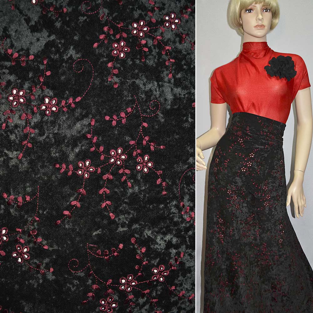 Мікровелюр стрейч чорний з бордовим вишивкою, ш.150. Склад тканини: Віскоза-60, Поліестер-35, Еластан-5. Щільність тканини 329 г/м.кв. Країна виробник: Південна Корея. М'який, тактильно приємний матеріал з ворсистою поверхнею, еластичний по качку. Його фактура нагадує мармур, за рахунок спрямування ворсу в дві сторони. Матеріал має безліч переваг. Велюр стійкий до механічних впливів, щільний, має хорошу теплоізоляцію, не меніться і досить практичний як у використанні, так і у догляді. Застосовується для пошиття різних видів одягу: суконь, спідниць, кофт, костюмів, кардиганів, вечірнього вбрання та карнавальних костюмів. Використовується для створення аксесуарів: шапок, чохлів, іграшок, а також у декорі інтер'єру.Дякуємо за ваш вибір.