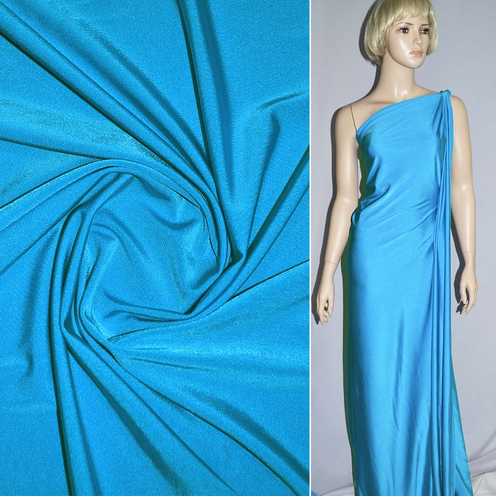 Лайкра бірюзова люмінесцентна ш.160. Склад тканини: Поліамід-90, Еластан-10. Щільність тканини 188 г/м.кв. Країна виробник: Південна Корея. Лайкра – тканина з дуже високою еластичністю. Полотно легке, м'яке, приємне навпомацки, досить тонке, але при цьому щільне і не прозоре. Легко розтягується і швидко повертається до попередньої форми. Матеріал стійкий до забруднень і легко відмивається. Лайкра не меніться, добре драпірується, лягати м'якими складками. Тканина зносостійка, повітропроникна.