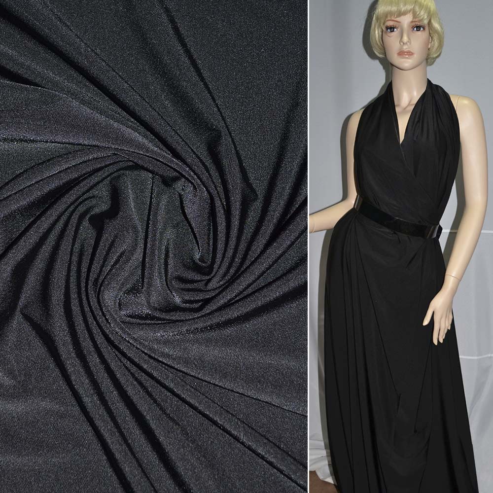 Лайкра чорна ш.160. Склад тканини: Поліамід-90, Еластан-10. Щільність тканини 188 г/м.кв. Країна виробник: Південна Корея. Лайкра – тканина з дуже високою еластичністю. Полотно легке, м'яке, приємне навпомацки, досить тонке, але при цьому щільне і не прозоре. Легко розтягується і швидко повертається до попередньої форми. Матеріал стійкий до забруднень і легко відмивається. Лайкра не меніться, добре драпірується, лягати м'якими складками. Тканина зносостійка, повітропроникна.