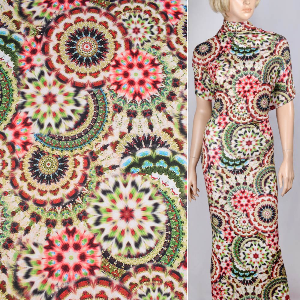 Мікрофібра молочна з зеленими рожевими колами калейдоскоп ш.166. Склад тканини: Поліамід-45, Поліестер-45, Еластан-10. Щільність тканини 180 г/м.кв. Країна виробник: Південна Корея. Мікрофібра – тканина з дуже високою еластичністю. Полотно легке, м'яке, приємне навпомацки, досить тонке, але при цьому щільне і не прозоре. Легко розтягується і швидко повертається до попередньої форми. Матеріал стійкий до забруднень і легко відмивається. Мікрофібра не меніться, добре драпірується, лягати м'якими складками. Тканина зносостійка, повітропроникна.