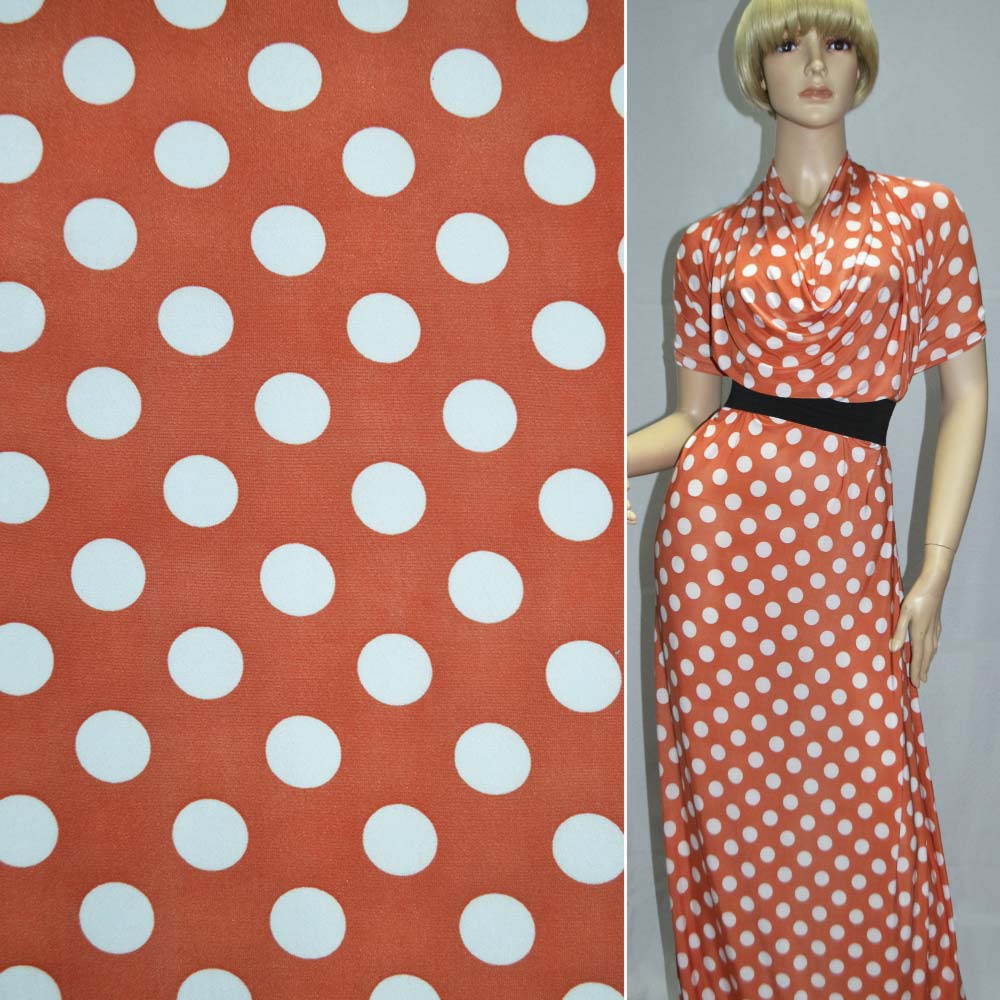Мікролайкра помаранчева в білі кола ш.170. Склад тканини: Поліамід-45, Поліестер-50, Еластан-5. Щільність тканини 164 г/м.кв. Країна виробник: Південна Корея. Мікролайкра – тканина з дуже високою еластичністю. Полотно легке, м'яке, приємне навпомацки, досить тонке, але при цьому щільне і не прозоре. Легко розтягується і швидко повертається до попередньої форми. Матеріал стійкий до забруднень і легко відмивається. Мікролайкра не меніться, добре драпірується, лягає м'якими складками. Тканина зносостійка, повітропроникна.