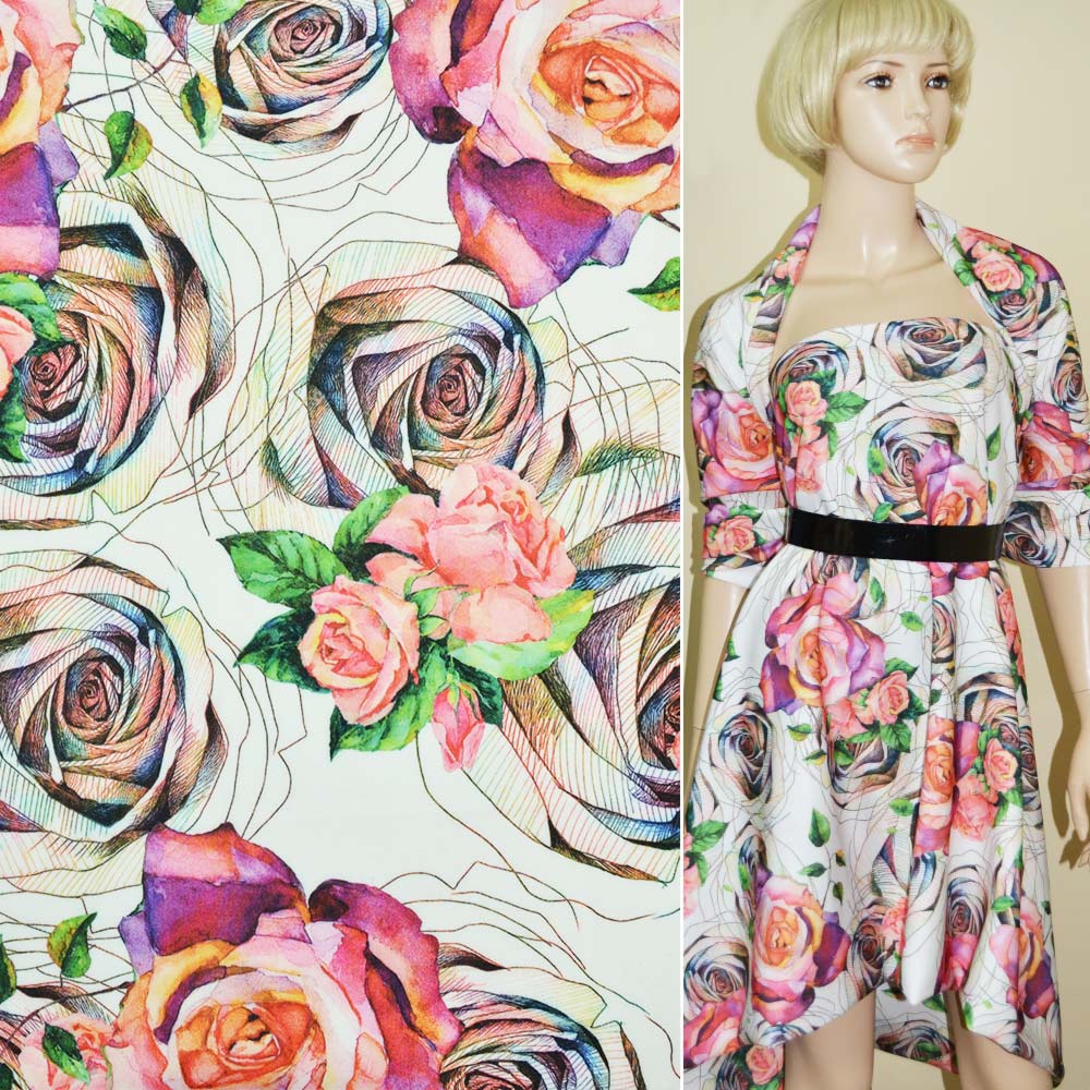 Трикотаж дайвінг білий в рожеві квіти ш.156 купить в розницу и оптом