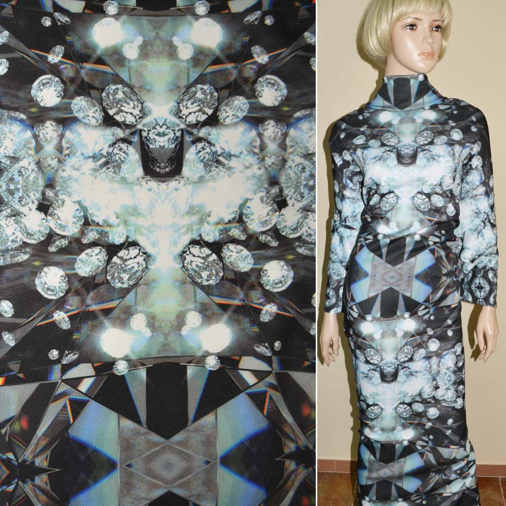 Трикотаж дайвінг чорний з геометричним сіро-синім принтом стрейч ш.155 купить в розницу и оптом