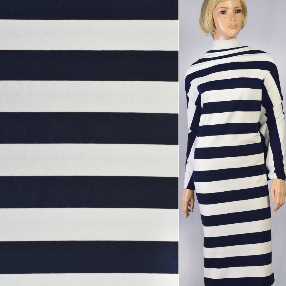 Трикотаж білий в синю смужку 5см, ш.170. Склад тканини: Віскоза-30, Поліамід-35, Поліестер-30, Еластан-5. Щільність тканини 316 г/м.кв. Країна виробник: Південна Корея. Трикотаж – це м'яка щільна матерія, не прозора. Приємна на дотик, комфортна в носінні. Завдяки вмісту синтетичних матерій, матеріал більш зносостійкий та надовго зберігає свій первісний вигляд. Тканина відрізняється своєю приємною текстурою, гарною розтяжністю, практично не здається. Трикотаж досить простий у догляді. Використовується для пошиття суконь, спортивних костюмів, легких жакетів, поло, футболок та багато іншого.Дякуємо за ваш вибір.