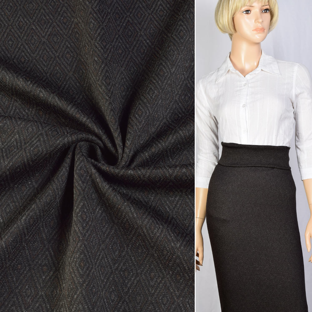 Трикотаж з віскозою BECKER жаккард чорно-сірі ромби, ш.117. Склад тканини: Віскоза-63, Поліакріл-34, Еластан-3. Щільність тканини 283 г/м.кв. Країна виробник: Німеччина. Трикотаж – це м'яка щільна матерія, не прозора. Приємна на дотик, комфортна в носінні. Завдяки вмісту синтетичних матерій, матеріал більш зносостійкий та надовго зберігає свій первісний вигляд. Тканина відрізняється своєю приємною текстурою, гарною розтяжністю, практично не здається. Трикотаж досить простий у догляді. Використовується для пошиття суконь, спортивних костюмів, легких жакетів, поло, футболок та багато іншого.Дякуємо за ваш вибір.