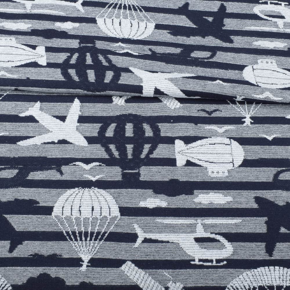 Джерсі синє темне в сріблясту смужку, літаки, парашути, ш.135 купить в розницу и оптом