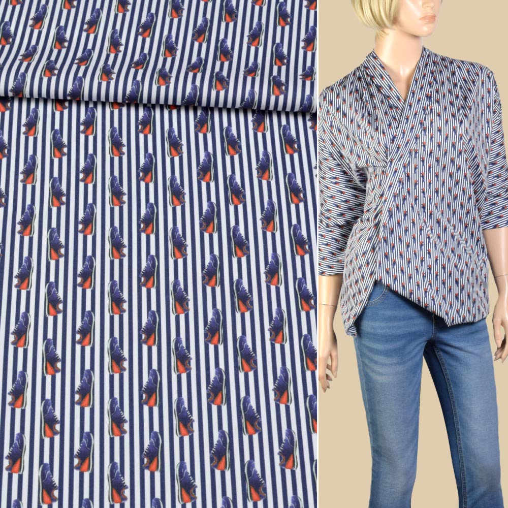 Котон стрейч білий в синю смугу і червоно-сині кросівки ш.145. Склад тканини: Бавовна-97, Еластан-3. Щільність тканини 99 г/м.кв. Країна виробник: Німеччина. Коттон - міцний, легкий, м'який матеріал, він легко вбирає вологу, добре пропускає повітря, має високу теплопровідність.