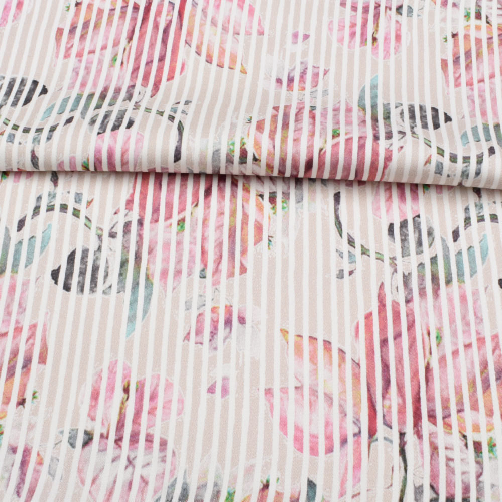 Коттон стрейч APANAGE бежевий, рожеві квіти, біла смужка, ш.128 купить в розницу и оптом