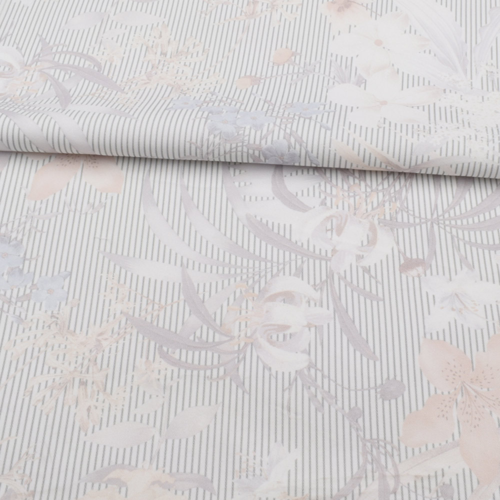 Коттон стрейч молочний в сіру смужку, бежеві, білі квіти, ш.140 купить в розницу и оптом