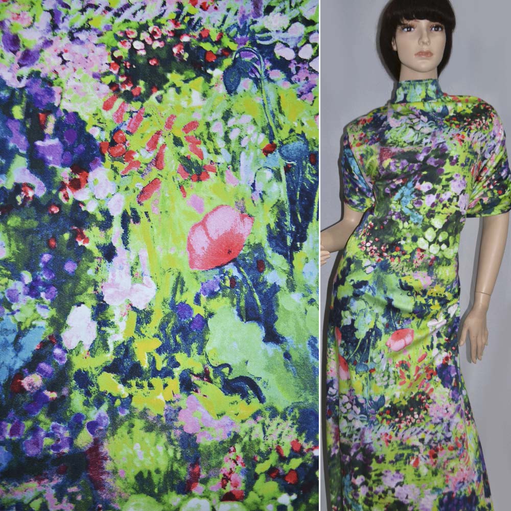 Котон стрейч зелений темний з салатово-рожевої абстракцією ш.145. Склад тканини: Бавовна-97, Еластан-3. Щільність тканини 194 г/м.кв. Країна виробник: Німеччина. Коттон - міцний, легкий, м'який матеріал, він легко вбирає вологу, добре пропускає повітря, має високу теплопровідність.