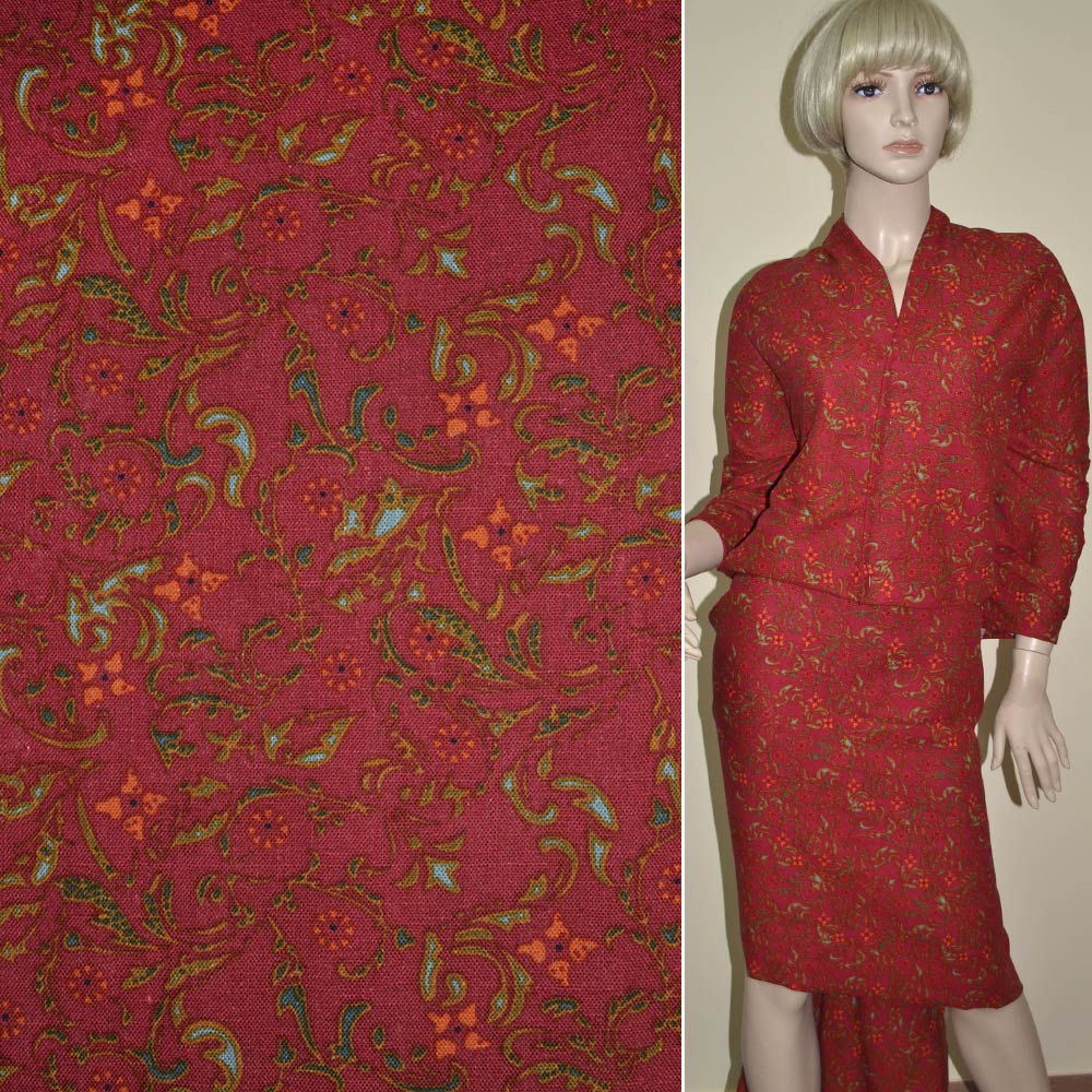 Льон червоний з золотисто-блакитними завитками і помаранчевими квітами ш.140. Склад тканини: Льон-70, Бавовна-30. Щільність тканини 167 г/м.кв. Країна виробник: Південна Корея. Льон – матеріал середньої щільності, натурального походження, використовується для пошиття літніх виробів. Гігроскопічний, повітропроникний, міцний, стійкий до носіння, прання та прасування. Поверхня тканини матова, а завдяки бавовні у складі, тактильно дуже м'яка та приємна на дотик, непрозора. У складках та складаннях не має значного формоутворення, лягає м'яко та пластично. Підходить для пошиття брючних костюмів вільного крою, піджаків, суконь, спідниць, сарафанів, сорочок.Дякуємо за ваш вибір.