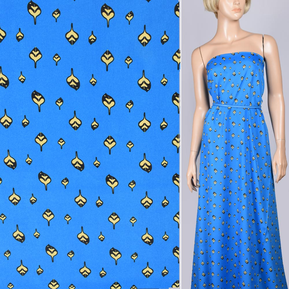 Креп поплін синій світлий з бежево-чорними листям ш.150. Склад тканини: Віскоза-40, Поліестер-60. Щільність тканини 74 г/м.кв. Країна виробник: Південна Корея. Лицьова сторона матерії має невеликий рельєфний малюнок, а виворітна гладка та приємна до тіла. Гарний шорсткий візерунок утворюється завдяки унікальному плетиву ниток полотна. Вироби з цієї матерії ідеально сідають по фігурі. Кріп практично не меніться, стійкий до зносу і практичний. Ккріп тканина, що добре тягнеться, яка чудово відновлює форму. Дані властивості дозволяють використовувати кріп поплін при виготовленні різноманітного одягу.Дякуємо за ваш вибір.