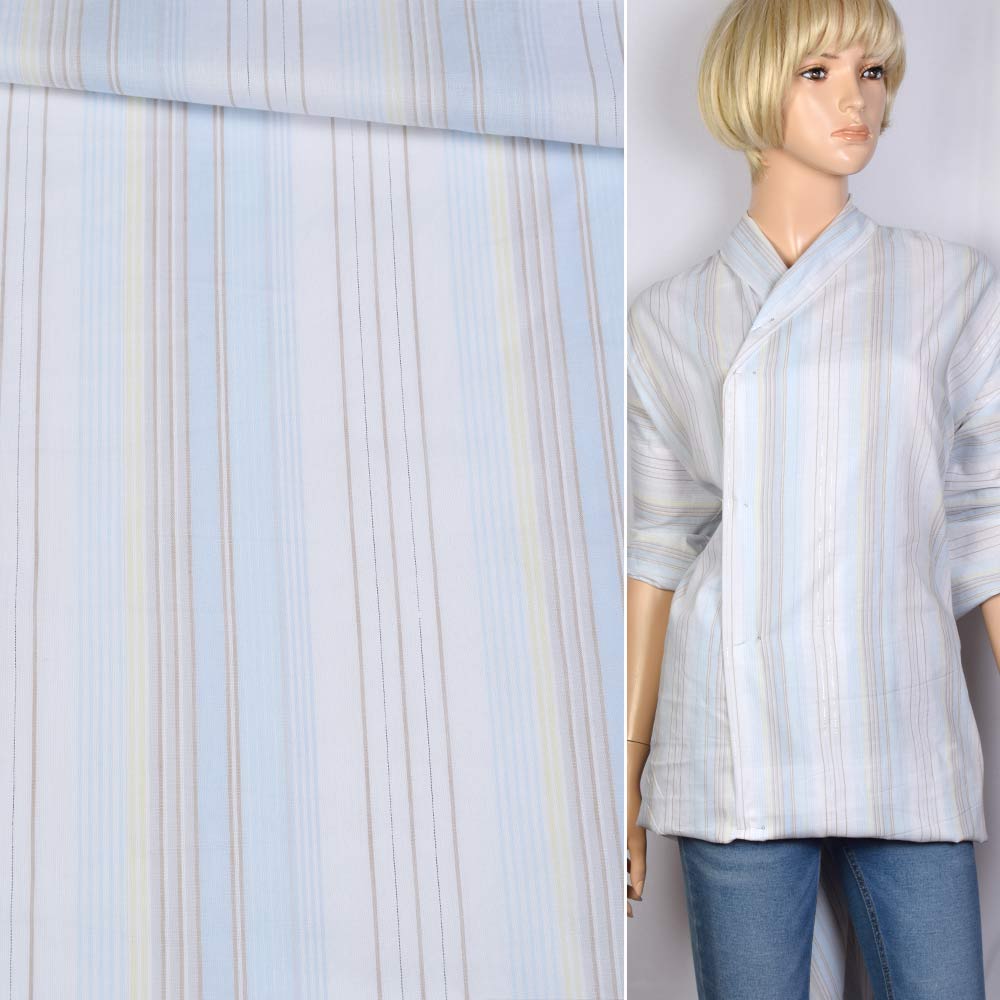 Котон в смужку жовто-блакитну, з метаниткою, білий, ш.145. Склад тканини: Віскоза-70, Метанитка-1, Бавовна-29. Щільність тканини 71 г/м.кв. Країна виробник: Південна Корея. Сорочкова тканина – тонка, має гладку поверхню. Якісний склад матеріалу забезпечує гігроскопічність, практичність та функціональність. Завдяки натуральним волокнам, тканина не викликає алергічних реакцій та тривалий час зберігає свій первісний вигляд. Тканина якісна, приємна до тіла, трохи тримає форму, добре драпірується.Дякуємо за ваш вибір.